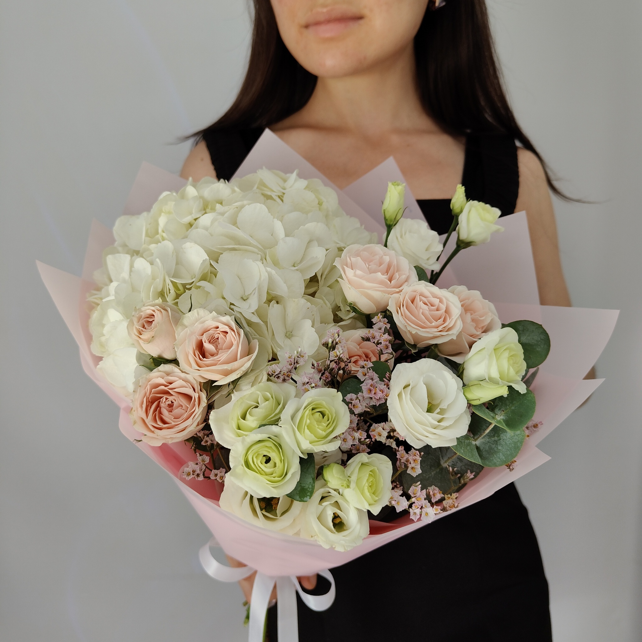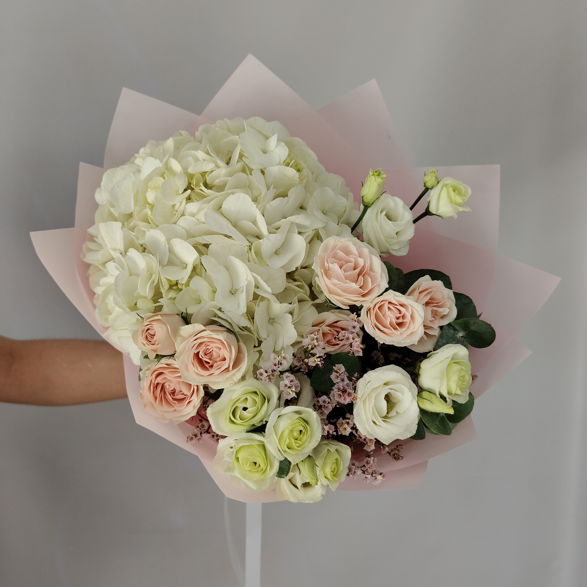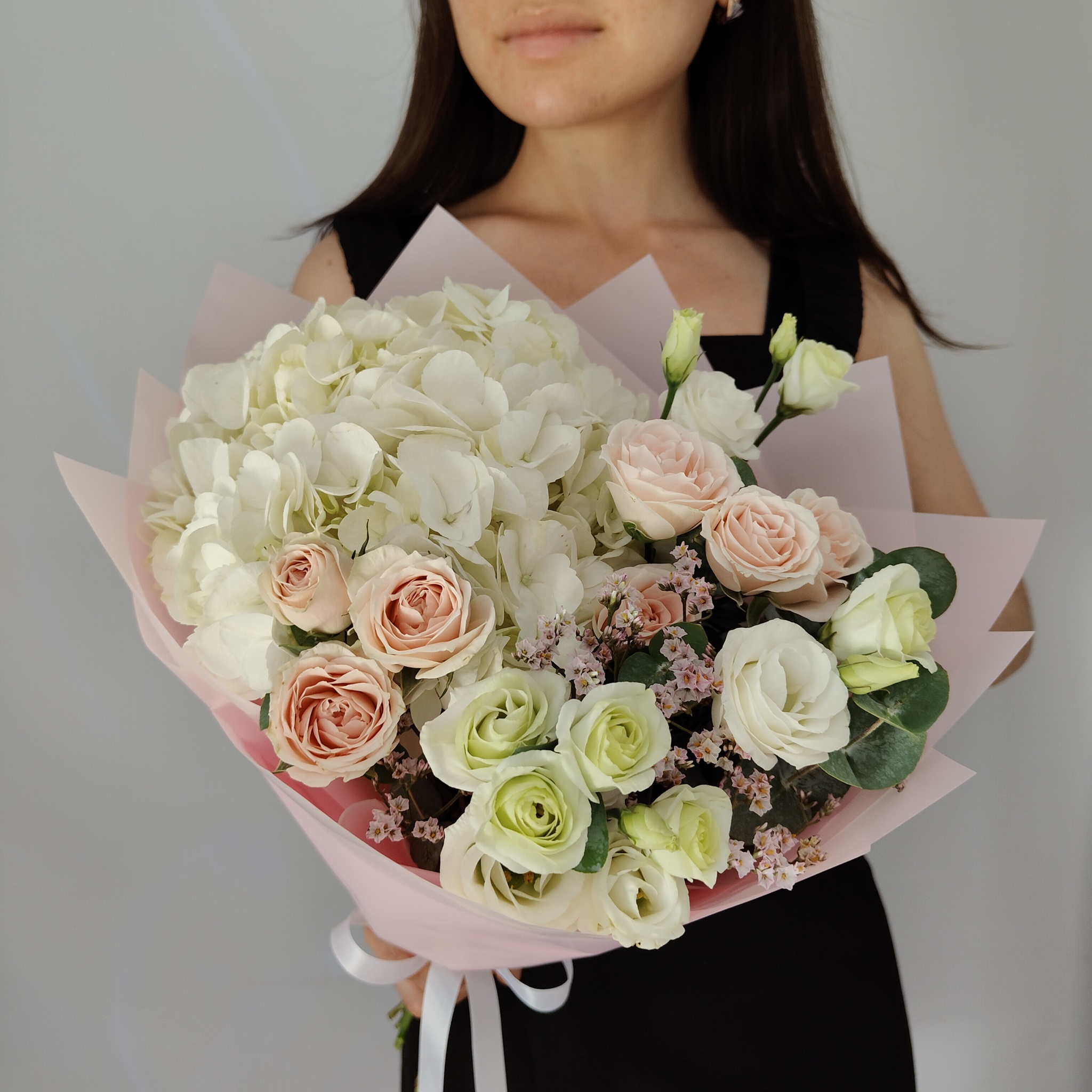 Букет из гортензии, нежно-розовых розочек и эустомы с ароматными веточками лимониума и эвкалипта.
