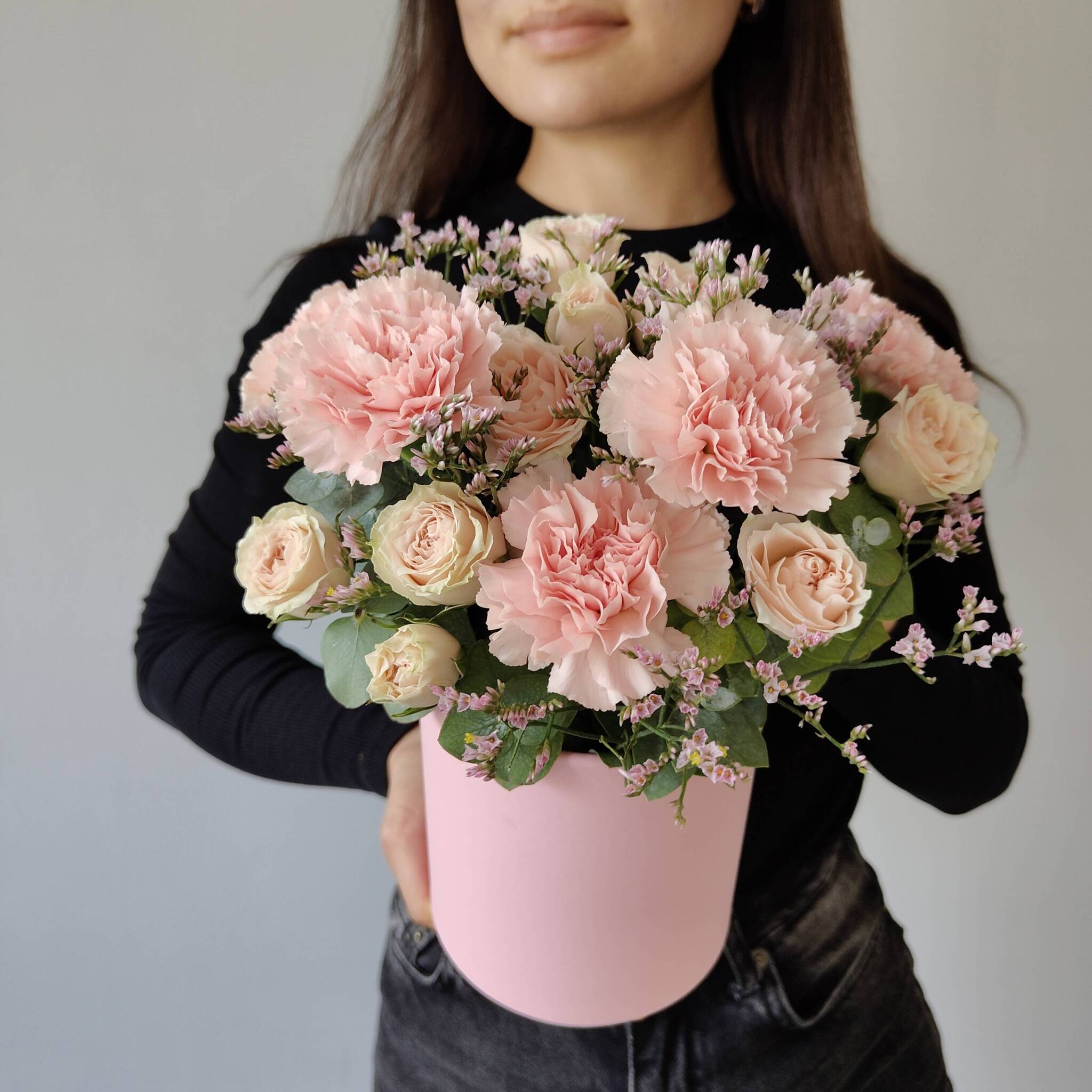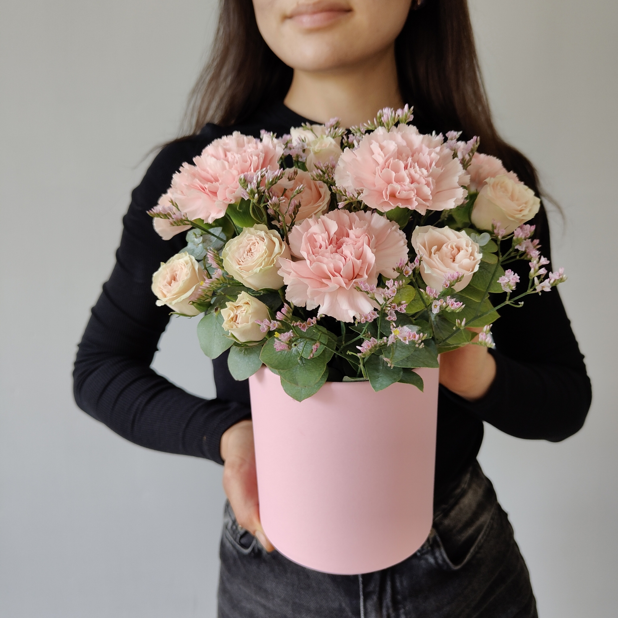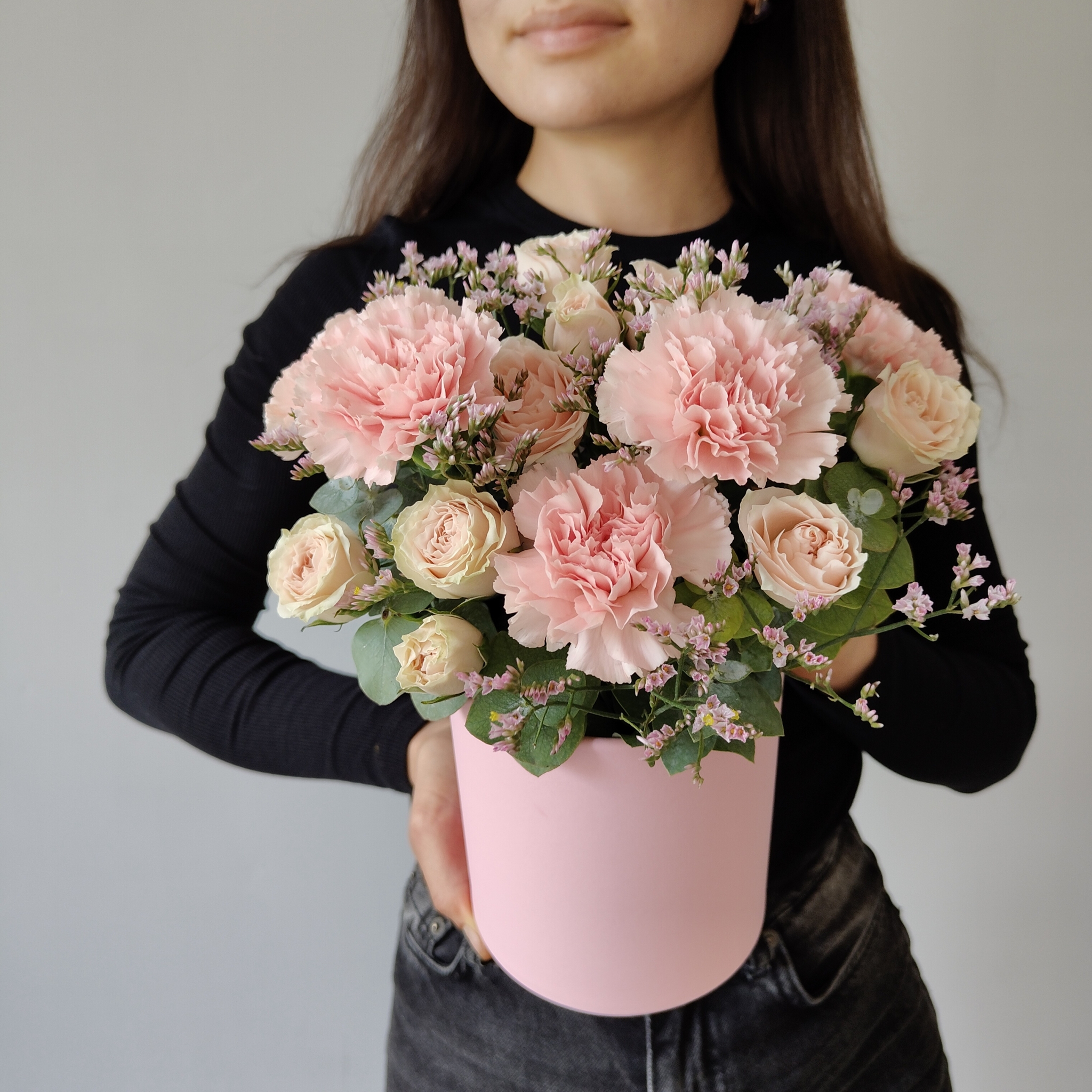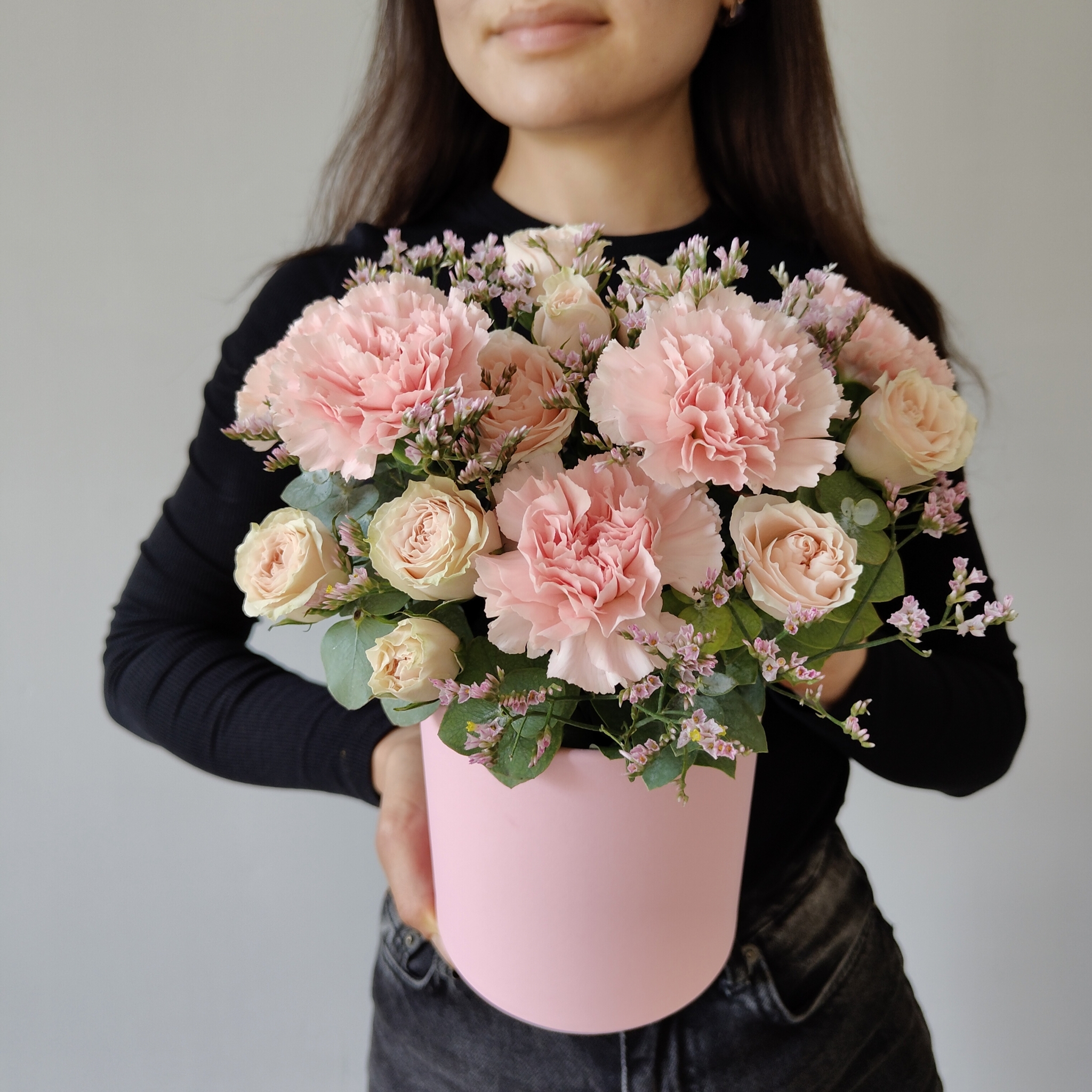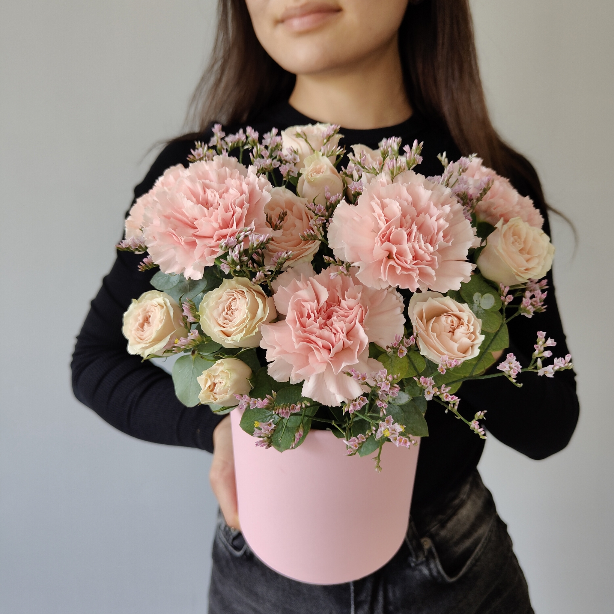 Состав товара: роза кустовая - 2 шт, гвоздика - 5 шт, лимониум - 1 шт, эвкалипт пучок - 1 шт губка флористическая - 1 шт, коробка шляпная 12х12 см -1 шт, инструкция по уходу за букетом и подкормка для цветов - 1 шт.
