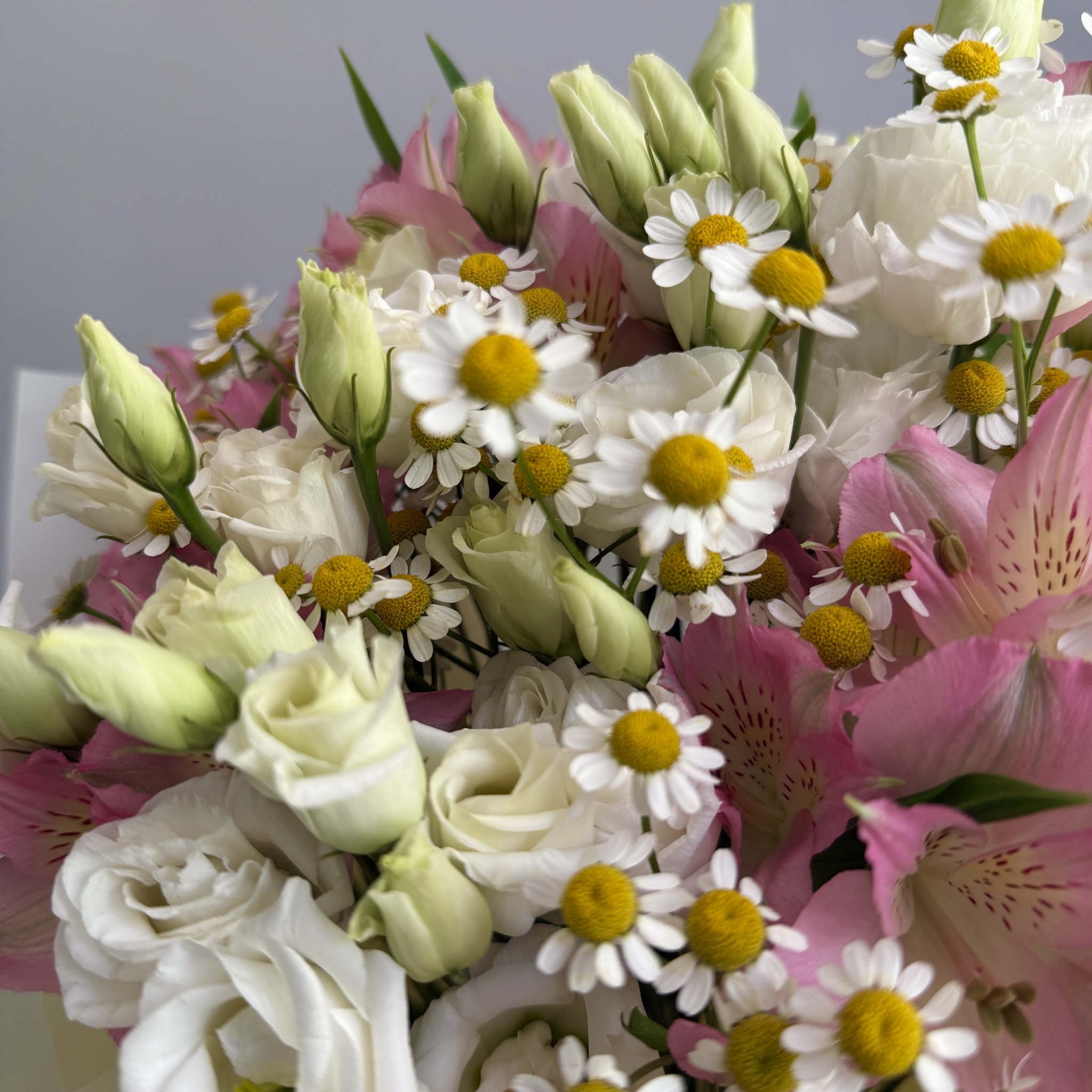Букет из эустомы, нежных альстромерий и ромашек.
